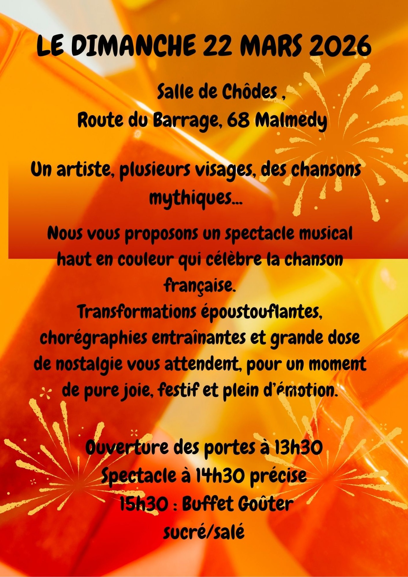 Top Senior Malmedy a le plaisir de vous inviter le Dimanche 22 mars 2026 à un spectacle musical transformiste mêlant la chanson française à l'art de la métamorphose.